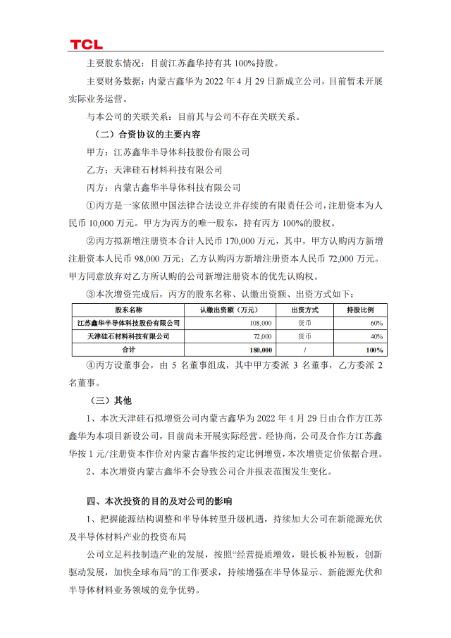 TCL科技表示,本次合作可以把握能源結構調整和半導體轉型升級機遇,持續(xù)加大公司在新能源光伏及半導體材料產業(yè)的投資布局公司立足科技制造產業(yè)的發(fā)展,按照“經營提質增效,鍛長板補短板,創(chuàng)新驅動發(fā)展,加快全球布局”的工作要求,持續(xù)增強在半導體顯示、新能源光伏和半導體材料業(yè)務領域的競爭優(yōu)勢。