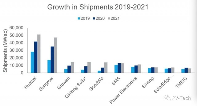 根據(jù)Wood Mackenzie排名,華為和陽(yáng)光電源連續(xù)第七年繼續(xù)領(lǐng)先,分別占據(jù)第一和第二的位置。2021年,華為的市場(chǎng)份額保持在穩(wěn)定的23%,陽(yáng)光電源緊隨其后,從2020年的約19%增至約21%。