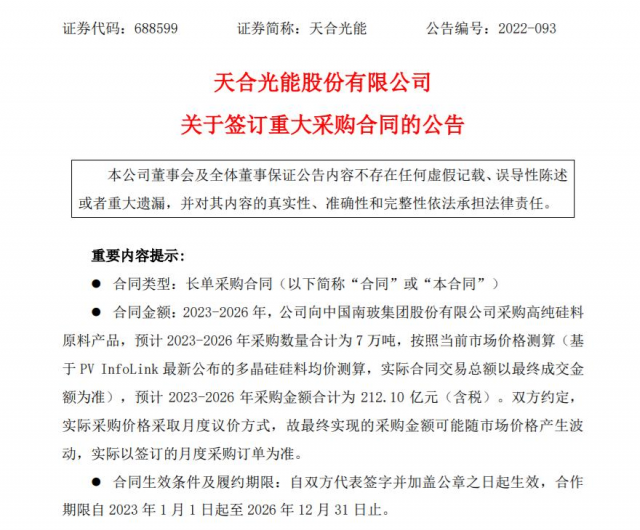 9月13日,天合光能(SH:688599)發(fā)布公告,公司與中國(guó)南玻集團(tuán)股份有限公司(證券簡(jiǎn)稱:南玻A;證券代碼:SZ:000012)簽訂高純硅料長(zhǎng)單采購(gòu)合同。合同約定,2023-2026 年間,天合光能擬向南玻集團(tuán)采購(gòu)7萬(wàn)噸高純硅料原料產(chǎn)品,按照當(dāng)前市場(chǎng)價(jià)格測(cè)算,采購(gòu)金額約為212.10億元(含稅)。