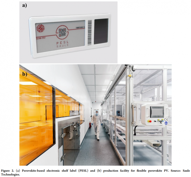 市場(chǎng)規(guī)模和增長(zhǎng)當(dāng)然不是唯一需要考慮的重要方面。從制造商的角度來(lái)看,開(kāi)發(fā)定制量最少的產(chǎn)品很重要,因?yàn)檫@會(huì)帶來(lái)額外的風(fēng)險(xiǎn)和成本。此外,如何將額外的功率預(yù)算貨幣化是非常重要的??紤]到所有這些,電子貨架標(biāo)簽似乎是最有吸引力的選擇之一。Saule 開(kāi)發(fā)的基于鈣鈦礦的電子貨架標(biāo)簽 (PESL) 的示例和用于制造柔性鈣鈦礦 PV 的試點(diǎn)生產(chǎn)設(shè)施如圖 2 所示。