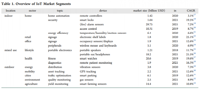 雖然物聯(lián)網(wǎng)市場(chǎng)巨大且增長(zhǎng)迅速,但要確定能量收集的最佳應(yīng)用并非易事。用例將定義需要由太陽(yáng)能模塊提供的功率預(yù)算。放置設(shè)備的環(huán)境和產(chǎn)品的外形尺寸定義了可能收集的能量的邊界條件。最重要的是,從業(yè)務(wù)角度來(lái)看,整合應(yīng)該是有意義的,因此需要進(jìn)行仔細(xì)的成本/收益分析,同時(shí)考慮到環(huán)境影響。為了解決這些問(wèn)題,Saule的方法是查看物聯(lián)網(wǎng)應(yīng)用程序中最大和增長(zhǎng)最快的部分,并按位置、部門(mén)、設(shè)備類(lèi)型和價(jià)值主張對(duì)其進(jìn)行分類(lèi)。表 1 總結(jié)了一些已識(shí)別的機(jī)會(huì)。