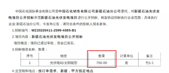 2022年4月1日,中國(guó)石化銷售有限公司新疆石油分公司公開招標(biāo)750套新疆石油光伏發(fā)電項(xiàng)目。