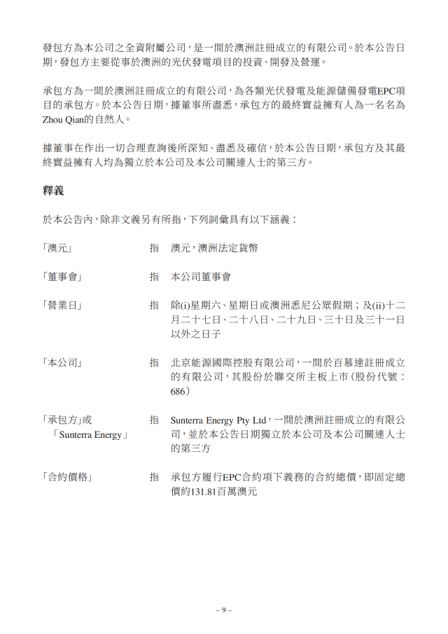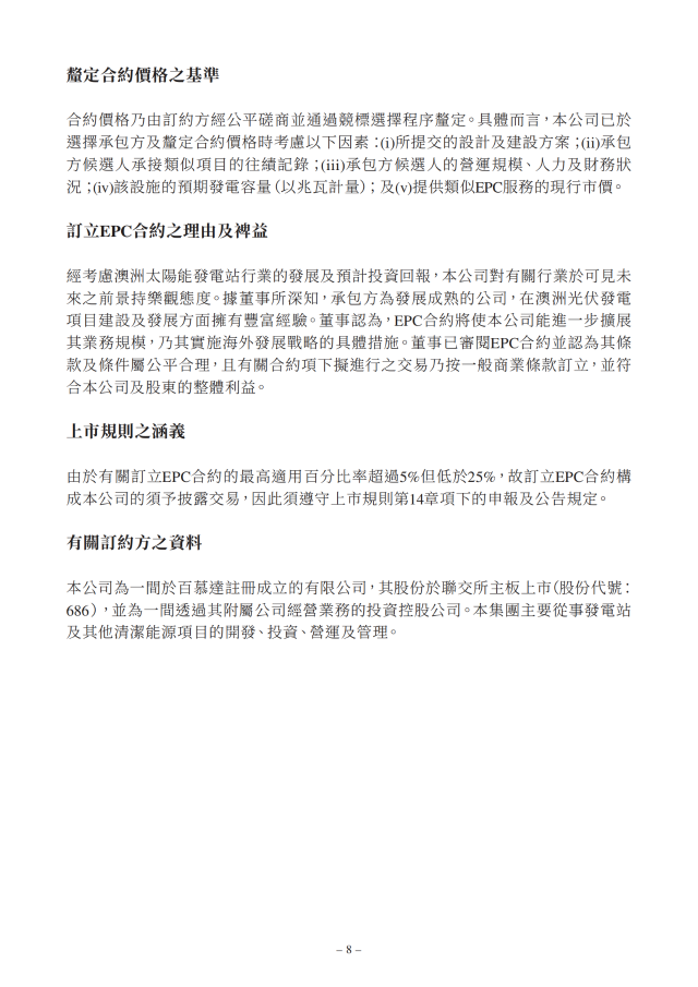 北京能源國(guó)際在公告中表示,經(jīng)考慮澳洲太陽(yáng)能發(fā)電站行業(yè)的發(fā)展及預(yù)計(jì)投資回報(bào),公司對(duì)有關(guān)行業(yè)于可見未來(lái)的前景持樂(lè)觀態(tài)度。據(jù)董事所深知,承包方為發(fā)展成熟的公司,在澳洲光伏發(fā)電項(xiàng)目建設(shè)及發(fā)展方面擁有豐富經(jīng)驗(yàn)。董事認(rèn)為,EPC合約將使公司能進(jìn)一步擴(kuò)展其業(yè)務(wù)規(guī)模,乃其實(shí)施海外發(fā)展戰(zhàn)略的具體措施。董事已審閱EPC合約并認(rèn)為其條款及條件屬公平合理,且有關(guān)合約項(xiàng)下擬進(jìn)行的交易乃按一般商業(yè)條款訂立,并符合公司及股東的整體利益。
