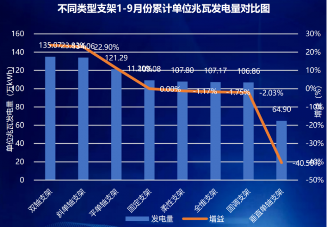 從支架實證數(shù)據(jù)分析,前三季度整體來看雙軸跟蹤系統(tǒng)發(fā)電量最高,斜單軸和平單軸次之,分別較固定支架發(fā)電量增益依次為23.83%、22.89%和11.2%;全維支架第一季度和第二季度由于支架跟蹤故障,正面輻照較低,7月份開始正常運行后發(fā)電量明顯提高,第三季度發(fā)電量最高;另外,柔性支架總體發(fā)電量略低于固定支架,兩種柔性支架之間發(fā)電量一致性相對較差,累計發(fā)電量差1.8%。同時,從實證出力曲線來看,跟蹤支架與固定支架、柔性支架相比功率曲線更加偏平,對電力系統(tǒng)更加友好。