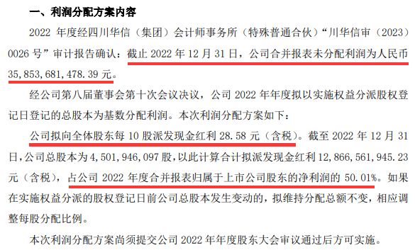截至去年底,該公司總股本約為45.02億股。這也意味著,其本次現(xiàn)金分紅總金額達到128.67億元,派息率為50.01%。以該公司4月25日收盤市值1708億元計算,其股息率達到7.53%。