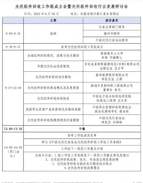 6月7日,中國(guó)光伏行業(yè)協(xié)會(huì)發(fā)布通知,協(xié)會(huì)將于2023年6月20日在安徽滁州召開(kāi)“光伏組件回收發(fā)展研討會(huì)”,從光伏組件回收的現(xiàn)狀、技術(shù)路徑、規(guī)模預(yù)測(cè)、價(jià)值與經(jīng)濟(jì)性分析、商業(yè)模式等維度,與研究機(jī)構(gòu)、行業(yè)組織、回收處理企業(yè)、電站投資與運(yùn)營(yíng)企業(yè)等業(yè)內(nèi)嘉賓共同分析探討光伏組件回收發(fā)展等焦點(diǎn)問(wèn)題。