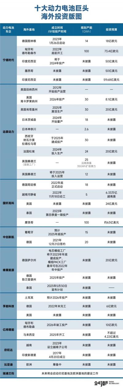動(dòng)力電池企業(yè)方面,據(jù)24潮團(tuán)隊(duì)不完全統(tǒng)計(jì),截至目前,國內(nèi)已有寧德時(shí)代、遠(yuǎn)景動(dòng)力、國軒高科、中創(chuàng)新航、蜂巢能源、孚能科技、億緯鋰能、欣旺達(dá)等10家動(dòng)力電池巨頭計(jì)劃或者已在海外有深度的產(chǎn)業(yè)布局,其公開對(duì)外披露的/媒體公開報(bào)道的項(xiàng)目達(dá)33個(gè),總投資預(yù)算超4000億元。