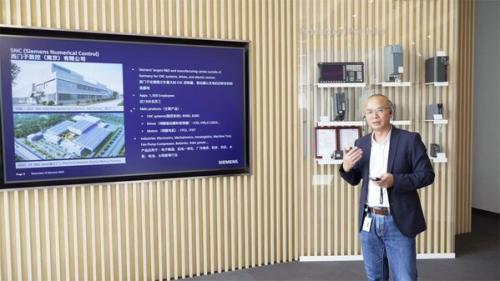 西門(mén)子數(shù)控(南京)有限公司總經(jīng)理周郁榮在2023西門(mén)子中國(guó)零碳先鋒媒體行首站為記者講解