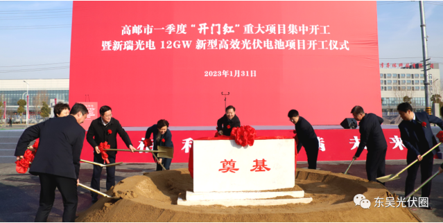 市委書記張利宣布開(kāi)工,并和出席儀式的領(lǐng)導(dǎo)嘉賓共同為項(xiàng)目培土奠基。據(jù)悉,新瑞光電12GW新型高效光伏電池項(xiàng)目總投資100億元,是高郵經(jīng)開(kāi)區(qū)有史以來(lái)首個(gè)百億元項(xiàng)目。該項(xiàng)目占地436畝,設(shè)備投資30億元,年產(chǎn)12GW高效TOPCon+HJT光伏電池。