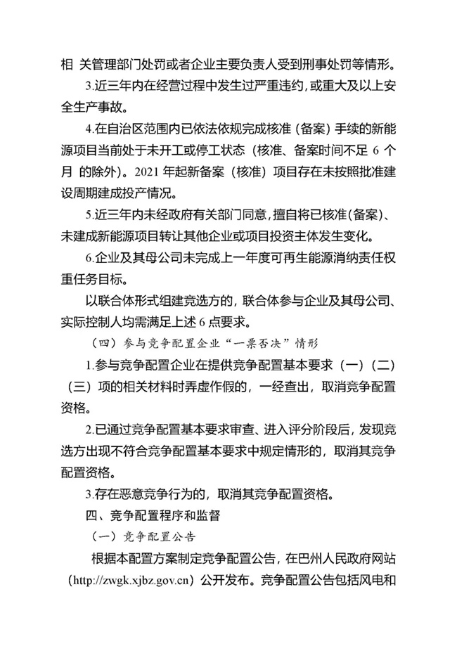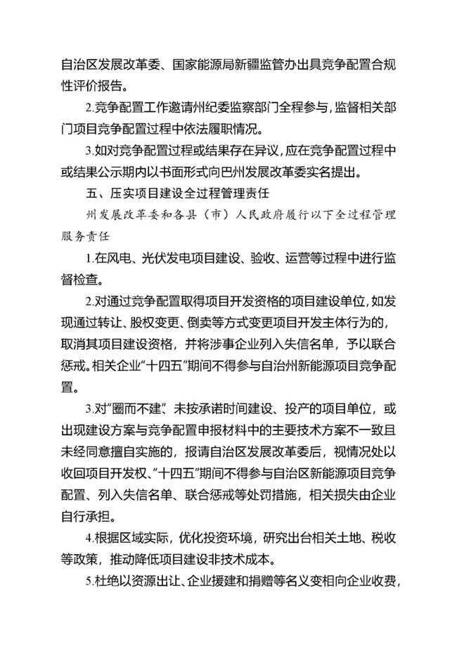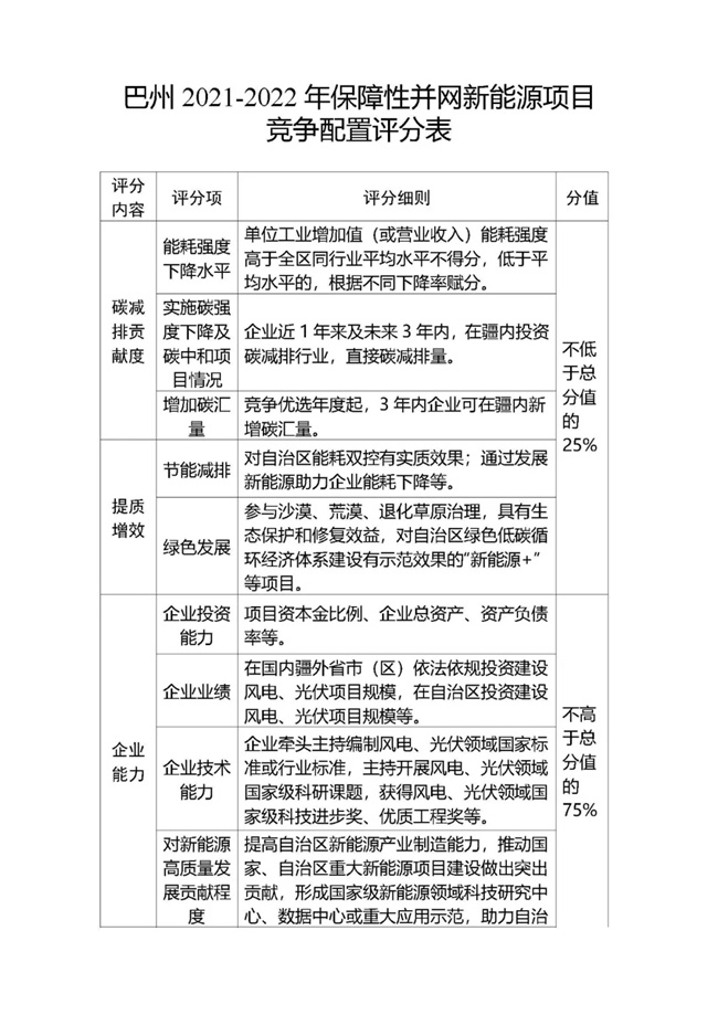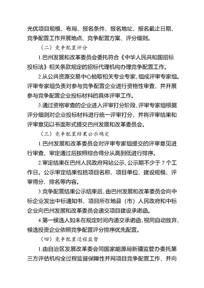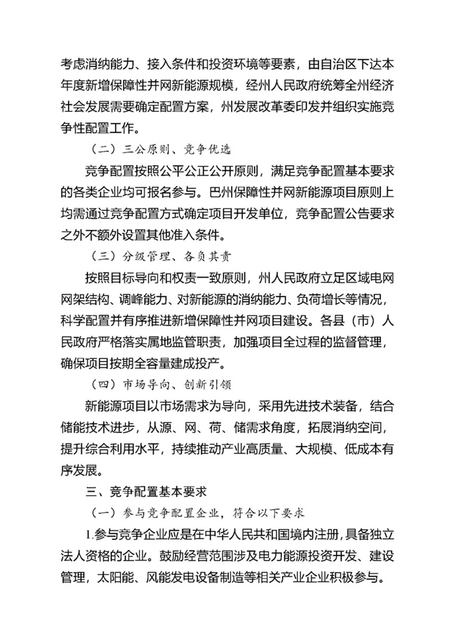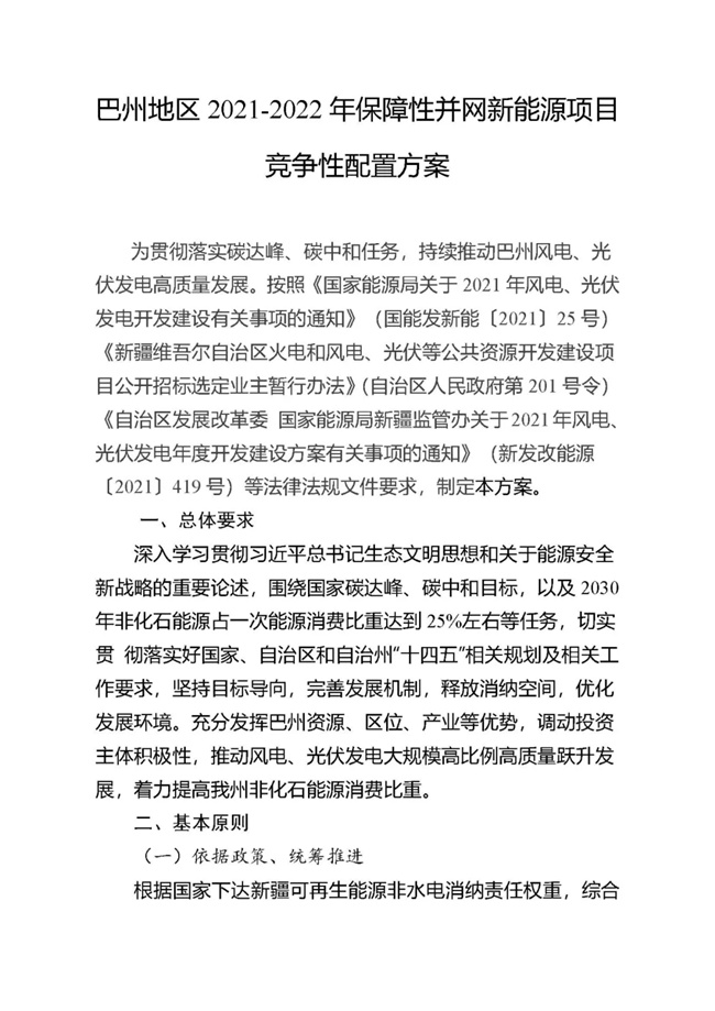 為貫徹落實碳達峰、碳中和任務,持續(xù)推動巴州風電、光伏發(fā)電高質量發(fā)展。按照《國家能源局關于2021年風電、光伏發(fā)電開發(fā)建設有關事項的通知》(國能發(fā)新能〔2021〕25號) 《新疆維吾爾自治區(qū)火電和風電、光伏等公共資源開發(fā)建設項目公開招標選定業(yè)主暫行辦法》(自治區(qū)人民政府第201號令)《自治區(qū)發(fā)展改革委國家能源局新疆監(jiān)管辦關于2021年風電、光伏發(fā)電年度開發(fā)建設方案有關事項的通知》(新發(fā)改能源〔2021〕419號)等法律法規(guī)文件要求,現將巴州2021-2022年保障性并網新能源項目競爭性配置公開優(yōu)選業(yè)主工作公告如下:
