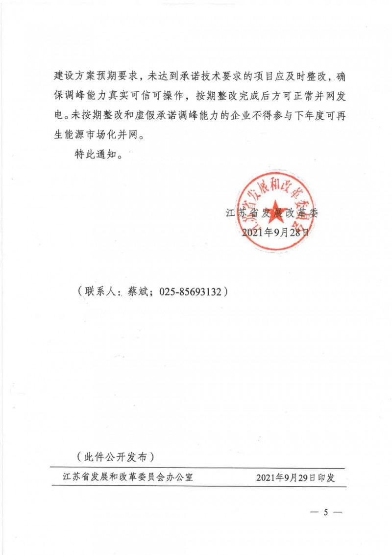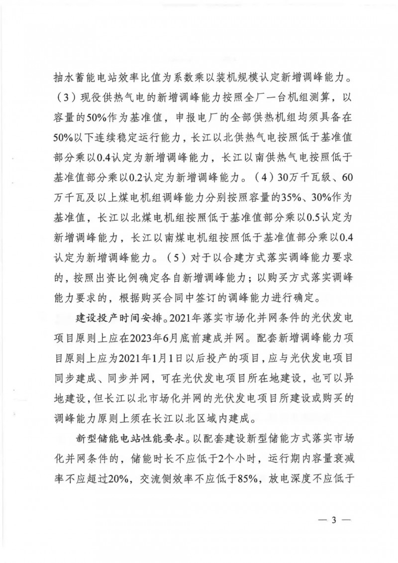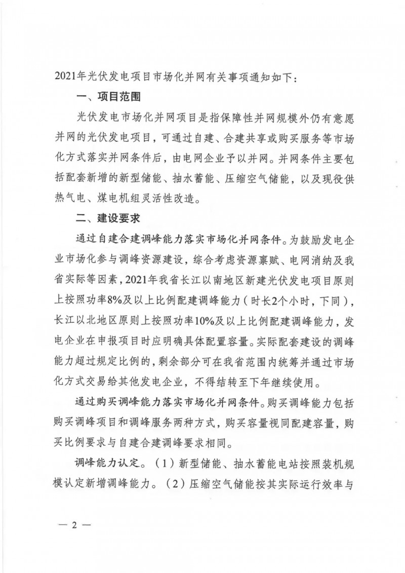 根據文件,2021年江蘇省長江以南地區(qū)新建光伏發(fā)電項目原則上按照功率8%及以上比例配建調峰能力(時長2小時,下同),長江以北地區(qū)原則上按照功率10%及以上比例配建調峰能力;調峰能力超過規(guī)定比例的,剩余部分可在江蘇省范圍內統(tǒng)籌并通過市場化方式交易給其他發(fā)電企業(yè)。