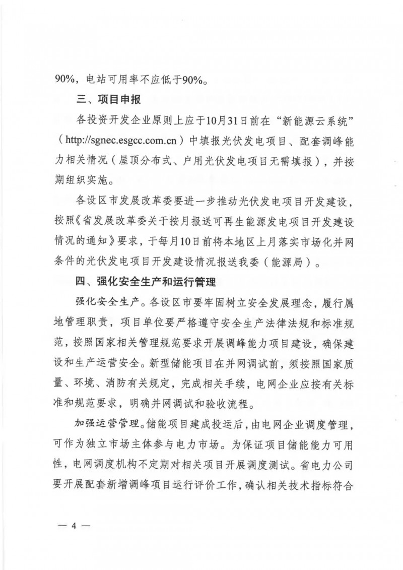 此外,文件要求各投資開發(fā)企業(yè)原則上應于10月31日前在“新能源云系統(tǒng)”中填報光伏發(fā)電項目、配套調峰能力相關情況。2021年落實的市場化項目原則上應于2023年6月底建成并網;配套調峰能力原則上應為2021年1月1日以后投產的項目,應與光伏發(fā)電項目同步建成、同步并網。