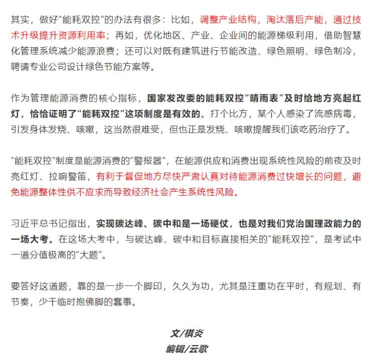 編者按:9月11日,國家發(fā)展改革委印發(fā)《完善能源消費(fèi)強(qiáng)度和總量雙控制度方案》,要求各地政府以能源資源配置更加合理、利用效率大幅提高為導(dǎo)向,以建立科學(xué)管理制度為手段,以提升基礎(chǔ)能力為支撐,強(qiáng)化和完善能耗雙控制度,深化能源生產(chǎn)和消費(fèi)革命,推進(jìn)能源總量管理、科學(xué)配置、全面節(jié)約,推動(dòng)能源清潔低碳安全高效利用,倒逼產(chǎn)業(yè)結(jié)構(gòu)、能源結(jié)構(gòu)調(diào)整,助力實(shí)現(xiàn)碳達(dá)峰、碳中和目標(biāo),促進(jìn)經(jīng)濟(jì)社會(huì)發(fā)展全面綠色轉(zhuǎn)型和生態(tài)文明建設(shè)實(shí)現(xiàn)新進(jìn)步。