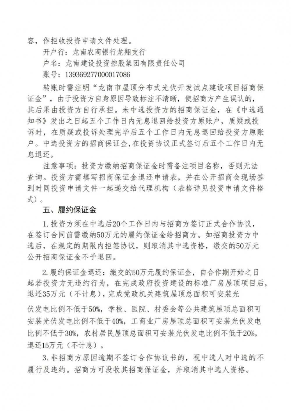 根據(jù)公告,本次招商項(xiàng)目總投資約20億元,首期投資約3億元。建設(shè)內(nèi)容為龍南市內(nèi)黨政機(jī)關(guān)、學(xué)校、醫(yī)院、村委會(huì)、工業(yè)園區(qū)廠房和農(nóng)村房屋屋頂光伏開發(fā)。通過招商方式引進(jìn)投資方負(fù)責(zé)項(xiàng)目建設(shè)及運(yùn)營。龍南建設(shè)投資控股集團(tuán)有限責(zé)任公司將可以建設(shè)光伏電站的所有屋頂以租賃方式租賃給投資方建設(shè)分布式光伏電站,若招商方需要?jiǎng)t共同投資,另行約定。投資方負(fù)責(zé)項(xiàng)目全部投資,包含但不限于建設(shè)期間的設(shè)計(jì)、設(shè)備采購、安裝、調(diào)試、驗(yàn)收等費(fèi)用以及運(yùn)營期間的管理、維護(hù)等費(fèi)用。