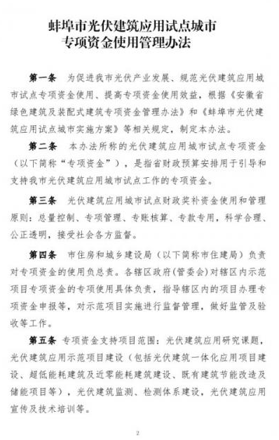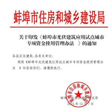 2月15日,安徽省蚌埠市住房和城鄉(xiāng)建設(shè)局發(fā)布《蚌埠市光伏建筑應用試點城市專項資金使用管理辦法》的通知。