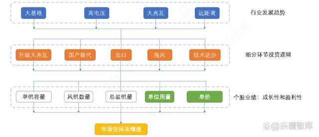 風(fēng)電行業(yè)的發(fā)展趨勢主要包括大兆瓦、高電壓、大基地和遠距離,細分環(huán)節(jié)的邏輯主要從“升級大兆瓦+國產(chǎn)替代+出口+海風(fēng)+技術(shù)進步”等五個方面去篩選。主要從量和價兩個方面判斷其未來的市場空間。