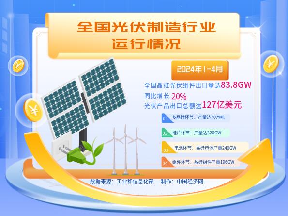 工業(yè)和信息化部12日發(fā)布2024年1-4月全國光伏制造行業(yè)運行情況。數(shù)據(jù)顯示,1-4月,我國光伏產(chǎn)業(yè)總體保持高位運行。