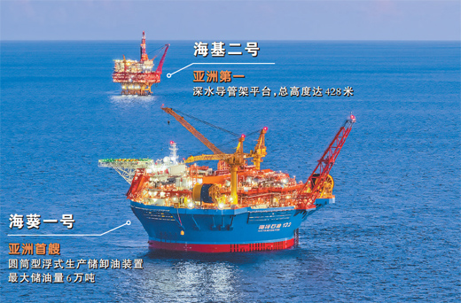 這一天,兩個“能源重器”——亞洲首艘圓筒型浮式生產(chǎn)儲卸油裝置(FPSO)“??惶?rdquo;、亞洲第一深水導(dǎo)管架平臺“?;?rdquo;攜手上崗,標(biāo)志著我國全類型深水油氣裝備的設(shè)計、建造和安裝能力達(dá)到世界一流水平。
