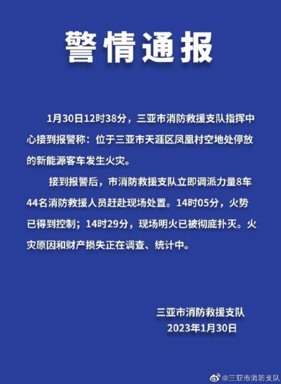 另?yè)?jù)三亞市消防支隊(duì)通報(bào)稱,30日12時(shí)38分,三亞市消防救援支隊(duì)指揮中心接到報(bào)警稱:位于三亞市天涯區(qū)鳳凰村空地處停放的新能源客車發(fā)生火災(zāi)。支隊(duì)調(diào)派8車44名消防救援人員趕赴現(xiàn)場(chǎng)處置。14時(shí)05分,火勢(shì)已得到控制;14時(shí)29分,現(xiàn)場(chǎng)明火已被徹底撲滅。火災(zāi)原因和財(cái)產(chǎn)損失正在調(diào)查、統(tǒng)計(jì)中。