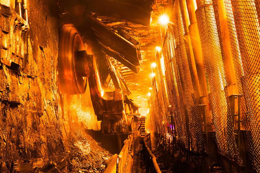 在井道中行駛20多分鐘,就到達(dá)了8.8米超大采高智能綜采工作面。只見(jiàn)直徑3.5米的兩只滾筒式采煤刀一前一后、一上一下,在接近3層樓高的煤壁上垂直飛旋,煤刀的刀頭異常鋒利,所到之處煤塊紛紛落下。一刀從機(jī)頭割到機(jī)尾,就是3000噸煤,這是常規(guī)工作面開(kāi)采的兩倍。