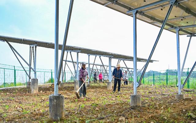 ▲6月25日,墊江縣硯臺鎮(zhèn)太安村農(nóng)光互補發(fā)電站,村民在光伏板下管理黃精、黃豆苗。記者 齊嵐森 攝