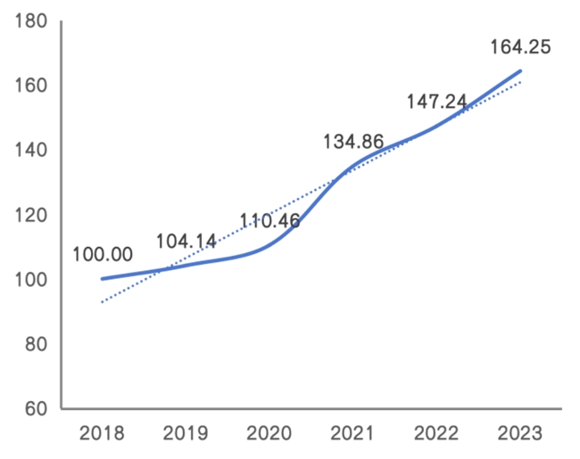 指數(shù)結(jié)果顯示,2023年,內(nèi)蒙古現(xiàn)代能源經(jīng)濟(jì)發(fā)展指數(shù)高速增長(zhǎng),達(dá)164.25點(diǎn),同比增長(zhǎng)11.55%,基期以來(lái)年均復(fù)合10.43%,發(fā)展質(zhì)速較前期進(jìn)一步提升。從分項(xiàng)指數(shù)看,低碳轉(zhuǎn)型、創(chuàng)新驅(qū)動(dòng)、經(jīng)濟(jì)高效和社會(huì)貢獻(xiàn)四大維度發(fā)展均穩(wěn)中向好、好中有進(jìn)、進(jìn)中蓄勢(shì),在錯(cuò)綜復(fù)雜的國(guó)內(nèi)外形勢(shì)挑戰(zhàn)下彰顯了內(nèi)蒙古現(xiàn)代能源經(jīng)濟(jì)的活力與潛力。