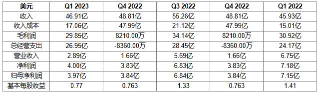2023財(cái)年第一財(cái)季凈利潤4.00億美元,去年同期凈利潤為7.18億美元,同比減少44.24%。