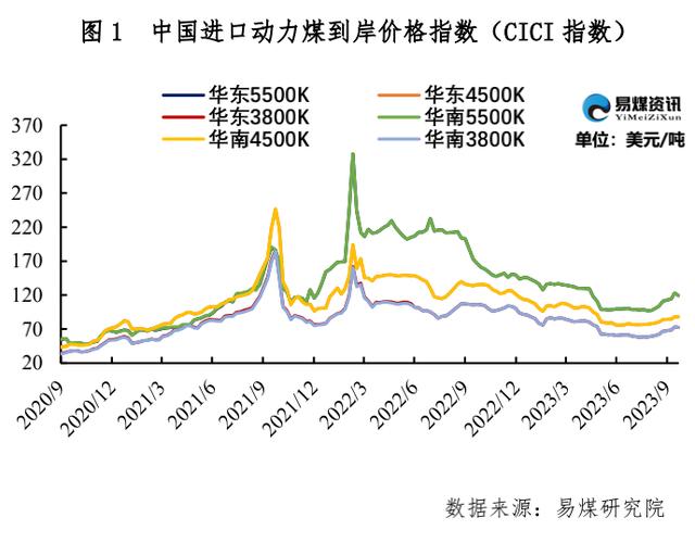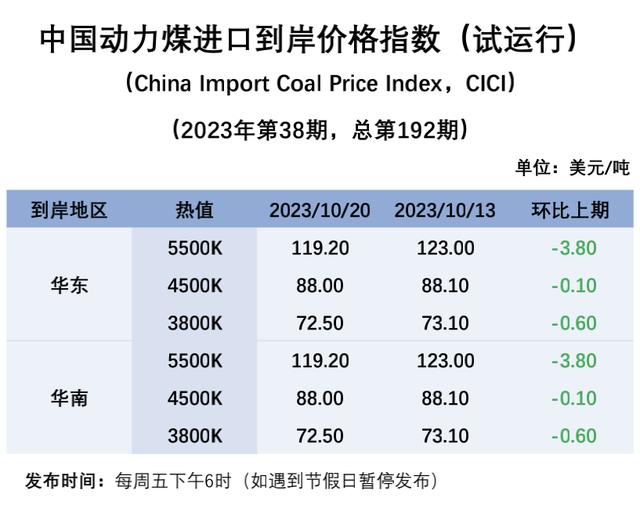 截至10月20日,5500K華東和華南到岸價均為119.20美元/噸,較上期下跌3.80美元/噸,較國內煤價低20-25元/噸;4500K華東和華南到岸價均為88.00美元/噸,較上期下跌0.10美元/噸,與國內煤價低20-25元/噸;3800K華東和華南到岸價均為72.50美元/噸,較上期下跌0.60美元/噸,較國內煤價低10-15元/噸。(理論測算,僅供參考)。