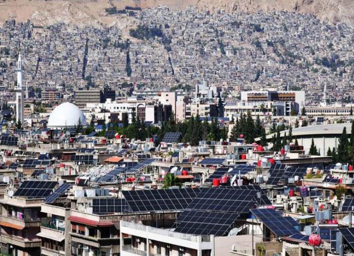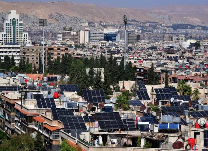10月25日,在敘利亞首都大馬士革,一些房屋的頂上架設著太陽能光伏發(fā)電板。