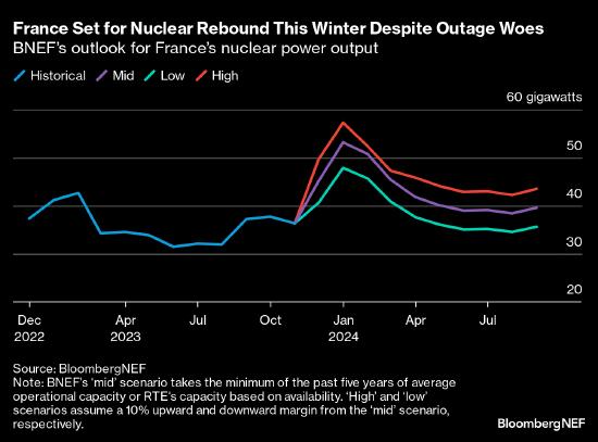 鑒于這些最新進展,彭博新能源財經將其對法國12月可用核電裝機容量的預測下調至45GW,較之前的預測低7%。不過,彭博新能源財經仍然預測,法國在即將到來冬季的可用核電裝機容量平均為50GW,比去年同期增長23%。