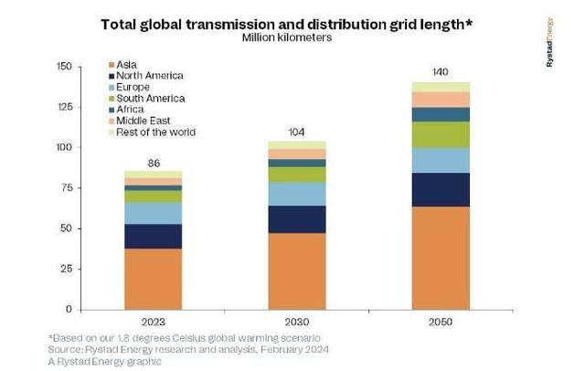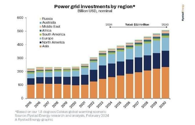 可再生能源的發(fā)展仍在以驚人的速度進行,2024年將有6440億美元用于新增產(chǎn)能,但過時和不足的電網(wǎng)可能會成為能源轉型的重大障礙。根據(jù)Rystad Energy的研究,如果世界要將全球變暖限制在比工業(yè)化前水平高1.8攝氏度的范圍內,那么在2030年之前需要3.1萬億美元的電網(wǎng)基礎設施投資。