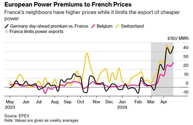 據(jù)法國電網(wǎng)運(yùn)營商RTE稱,自3月初以來,向比利時(shí)、德國、瑞士和意大利輸送電力的能力已經(jīng)減少。這使得這些國家無法進(jìn)口更便宜的法國核電,并推高了整個(gè)地區(qū)的批發(fā)價(jià)格。根據(jù)RTE的說法,這些限制應(yīng)該在5月初得到解決,但從8月中旬開始可能會有更多的限制。