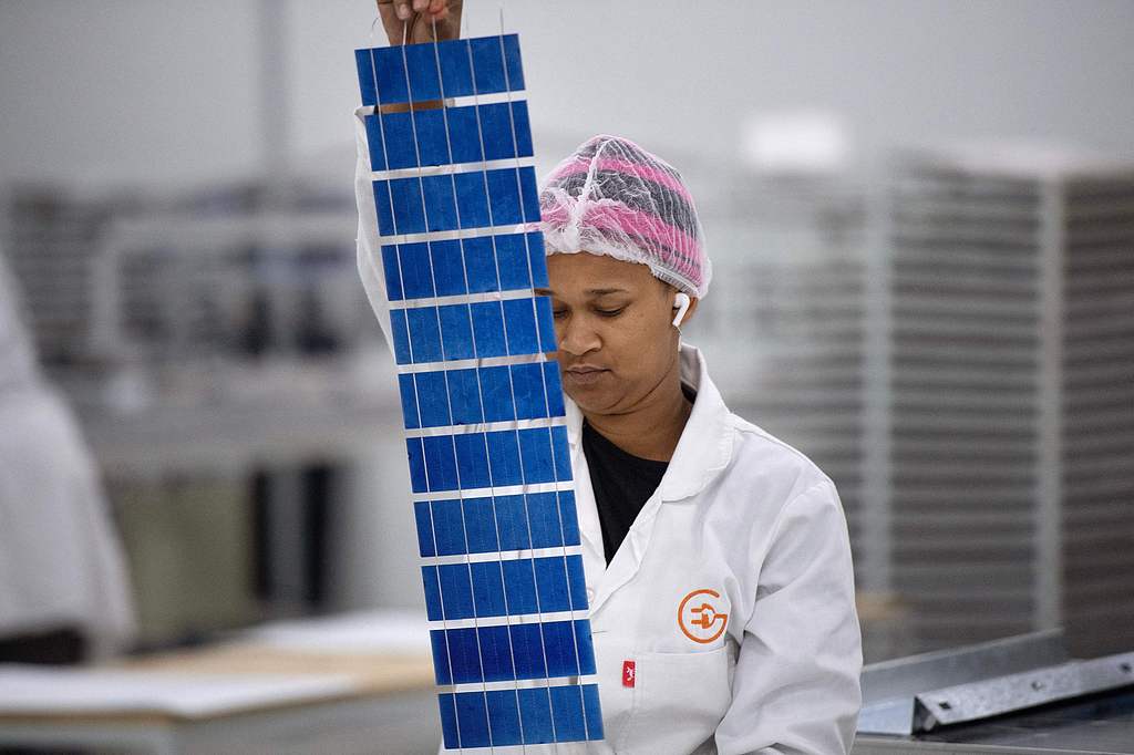 當(dāng)?shù)貢r(shí)間2023年10月25日,南非開普敦,一名婦女在只有女性員工的太陽能電池板工廠“非洲能源”檢查組件。