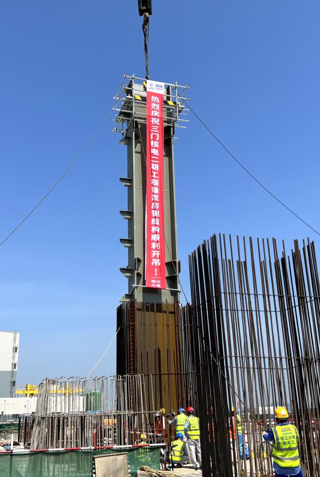 本網(wǎng)訊 7月27日上午,中國能建設計參建的三門核電二期工程循泵房鋼結(jié)構(gòu)正式開吊。