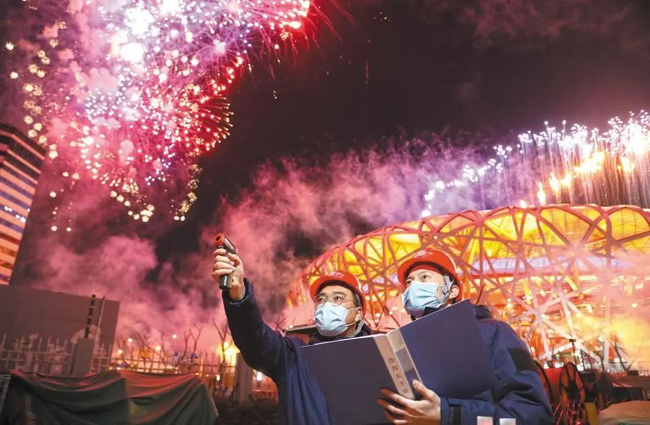 北京冬奧會閉幕式期間,國網(wǎng)北京電力冬奧保障人員在國家體育場附近巡檢供電設備。翟磊 攝