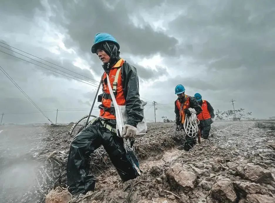 臺風“梅花”在浙江舟山普陀沿海登陸后,國網(wǎng)浙江電力員工穿過泥濘的田地前往故障點開展搶修。程夢玨 攝