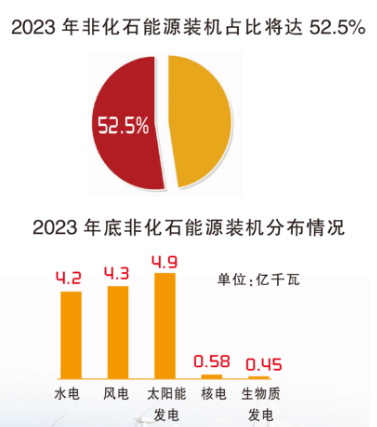 《報告》預計,在新能源發(fā)電快速發(fā)展帶動下,2023年新投產(chǎn)的總發(fā)電裝機以及非化石能源發(fā)電裝機規(guī)模將再創(chuàng)新高,其中全國新增發(fā)電裝機規(guī)模有望達到2.5億千瓦左右,新增非化石能源發(fā)電裝機1.8億千瓦。到2023年底,全國發(fā)電裝機達28.1億千瓦左右,非化石能源發(fā)電裝機合計14.8億千瓦,占總裝機比重上升至52.5%左右。其中,水電4.2億千瓦、并網(wǎng)風電4.3億千瓦、并網(wǎng)太陽能發(fā)電4.9億千瓦、核電5846萬千瓦、生物質(zhì)發(fā)電4500萬千瓦左右,太陽能發(fā)電及風電裝機規(guī)模將在2023年首超水電裝機規(guī)模 。