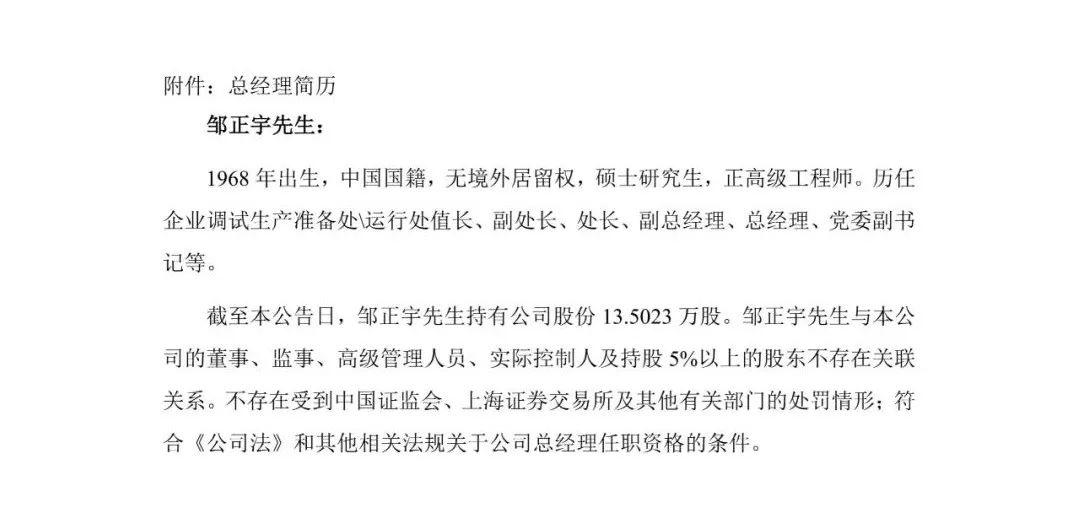 中國核電于4月25日召開第四屆董事會第十一次會議,審議通過了《關于聘任公司總經(jīng)理的議案》,決定聘任鄒正宇先生擔任公司總經(jīng)理職務,任期自董事會審議通過之日起至本屆董事會任期屆滿日止。