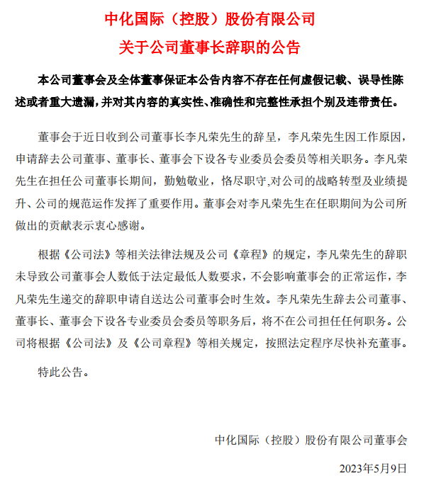 5月9日,中化國(guó)際(控股)股份有限公司(以下簡(jiǎn)稱“中化國(guó)際”)發(fā)布公告,董事會(huì)于近日收到公司董事長(zhǎng)李凡榮的辭呈,李凡榮因工作原因,申請(qǐng)辭去公司董事、董事長(zhǎng)、董事會(huì)下設(shè)各專業(yè)委員會(huì)委員等相關(guān)職務(wù)。