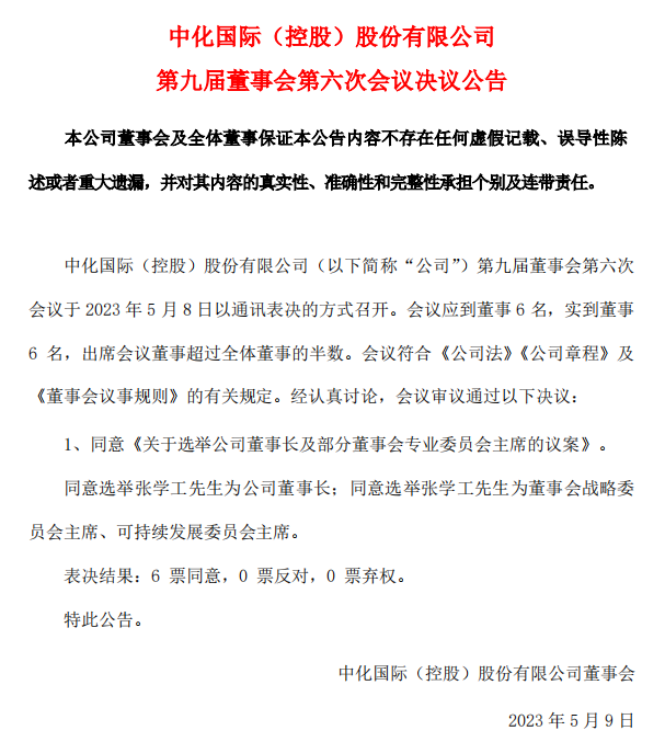 同日,中化國(guó)際發(fā)布公告,同意選舉張學(xué)工為公司董事長(zhǎng);同意選舉張學(xué)工為董事會(huì)戰(zhàn)略委員會(huì)主席、可持續(xù)發(fā)展委員會(huì)主席。