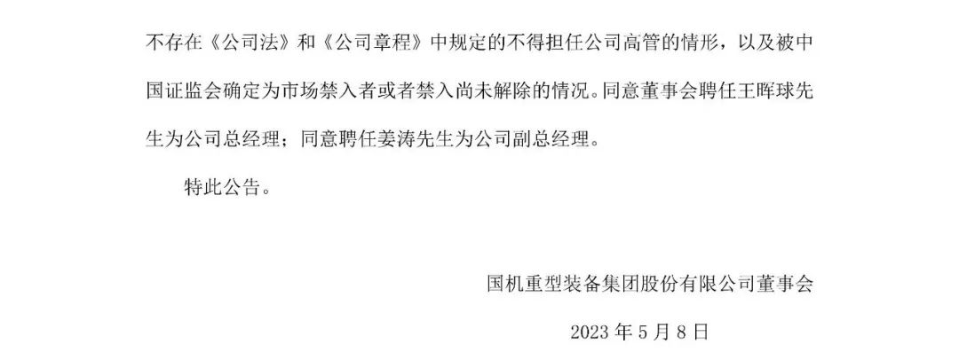 5月6日,國(guó)機(jī)重裝董事會(huì)審議通過了《關(guān)于聘任公司總經(jīng)理、副總經(jīng)理的議案》,同意聘任王暉球?yàn)楣究偨?jīng)理;同意聘任姜濤為公司副總經(jīng)理。