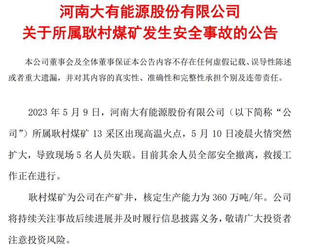 5月10日晚間大有能源公告,2023年5月9日,公司所屬耿村煤礦13采區(qū)出現(xiàn)高溫火點,5月10日凌晨火情突然擴(kuò)大,導(dǎo)致現(xiàn)場5名人員失聯(lián)。目前其余人員全部安全撤離,救援工作正在進(jìn)行。