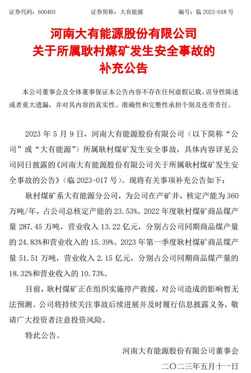 2023年5月9日,河南大有能源股份有限公司耿村煤礦13采區(qū)出現(xiàn)高溫火點(diǎn),5月10日凌晨火情突然擴(kuò)大,導(dǎo)致現(xiàn)場5名人員失聯(lián)。