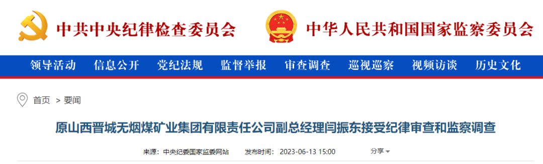 中央紀(jì)委國(guó)家監(jiān)委網(wǎng)站6月13日消息,據(jù)山西省紀(jì)委監(jiān)委消息:原山西晉城無(wú)煙煤礦業(yè)集團(tuán)有限責(zé)任公司副總經(jīng)理閆振東涉嫌嚴(yán)重違紀(jì)違法,目前正接受山西省紀(jì)委監(jiān)委紀(jì)律審查和監(jiān)察調(diào)查。