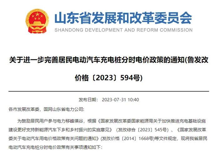 山東省發(fā)改委2023年7月31日發(fā)布《關(guān)于進一步完善居民電動汽車充電樁分時電價政策的通知》