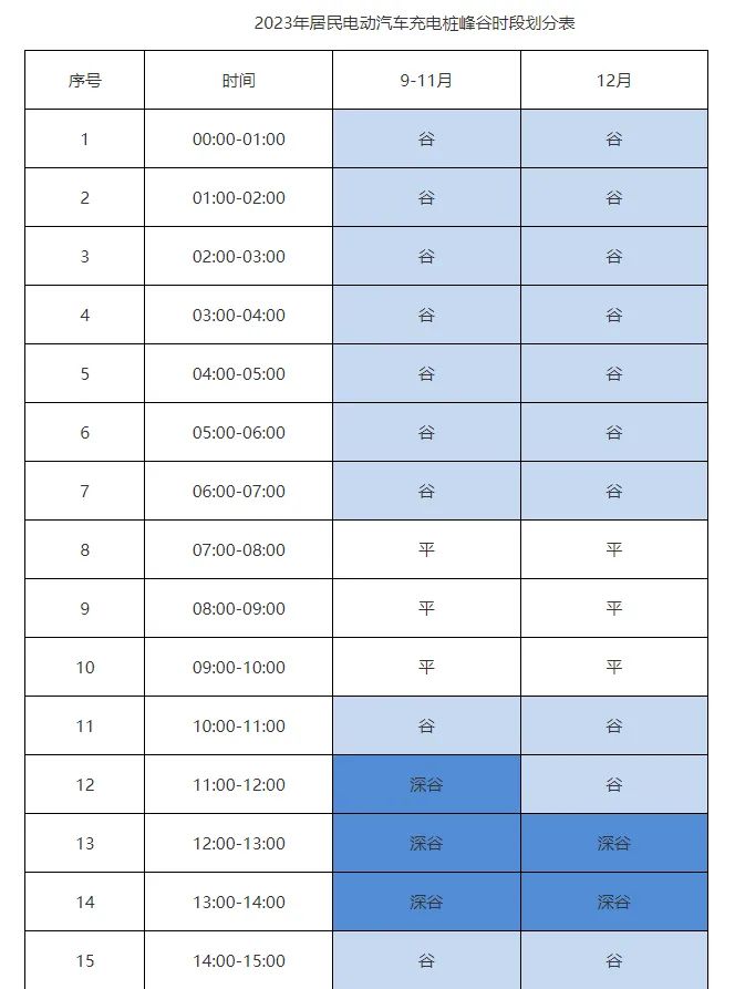 由此可見,如果車主選擇在深谷時段充電,將比之前的谷時段每度電節(jié)省0.163元。記者從時段劃分表可見,9月-11月的深谷時段為11點至14點,12月的深谷時段為12點至14點。