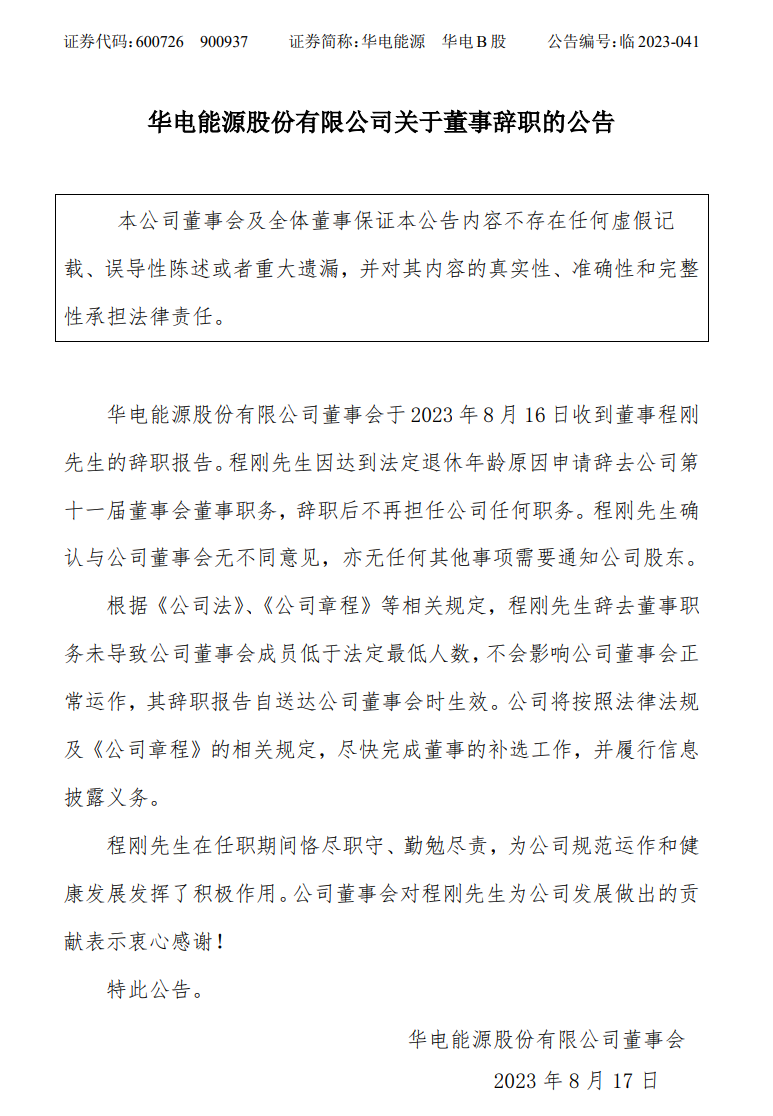 華電能源發(fā)布公告稱,公司董事會于8月16日收到董事程剛先生的辭職報告。程剛先生因達到法定退休年齡原因申請辭去公司第十一屆董事會董事職務(wù),辭職后不再擔任公司任何職務(wù)。