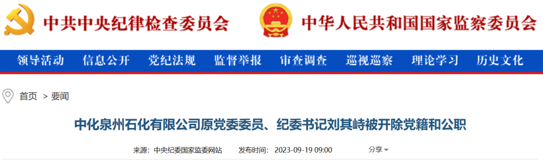 中央紀委國家監(jiān)委網站9月19日消息,據(jù)中國中化控股有限責任公司紀檢監(jiān)察組、福建省紀委監(jiān)委消息:日前,中國中化控股有限責任公司紀檢監(jiān)察組、福建省泉州市監(jiān)委對中化泉州石化有限公司原黨委委員、紀委書記劉其峙嚴重違紀違法問題進行了紀律審查和監(jiān)察調查。