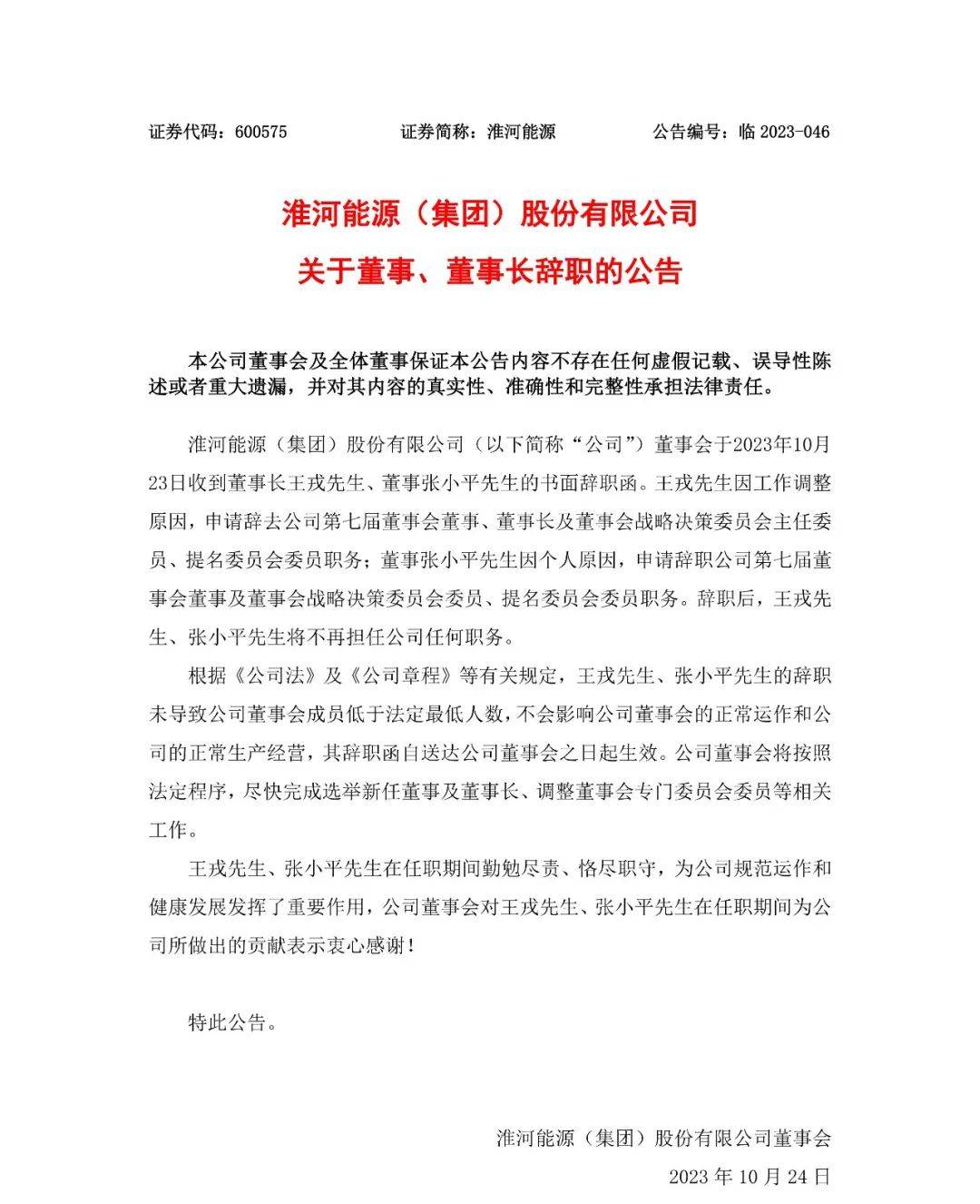 10月23日,淮河能源發(fā)布公告,董事會于2023年10月23日收到董事長王戎先生、董事張小平先生的書面辭職函。王戎先生因工作調(diào)整原因,申請辭去公司第七屆董事會董事、董事長及董事會戰(zhàn)略決策委員會主任委員、提名委員會委員職務(wù);董事張小平先生因個人原因,申請辭職公司第七屆董事會董事及董事會戰(zhàn)略決策委員會委員、提名委員會委員職務(wù)。