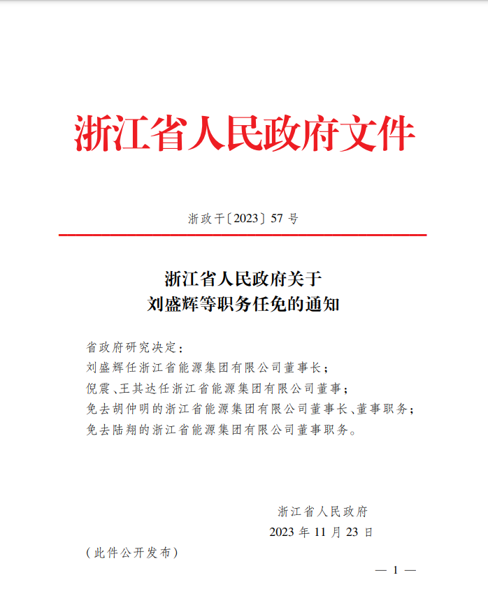 近日,據(jù)浙江省政府文件顯示,經(jīng)研究決定,劉盛輝任浙江省能源集團有限公司董事長;倪震、王其達任浙江省能源集團有限公司董事;免去胡仲明的浙江省能源集團有限公司董事長、董事職務(wù);免去陸翔的浙江省能源集團有限公司董事職務(wù)。
